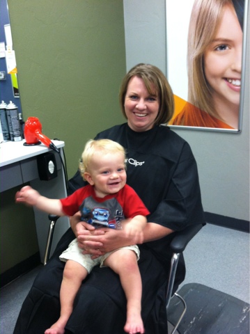 All in all he did fantastic and they even had a little certificate with a spot to put a few strands of his hair commemorating this momentous occasion. He looks a little more grown up but he still has his curls which made the grandmas happy.